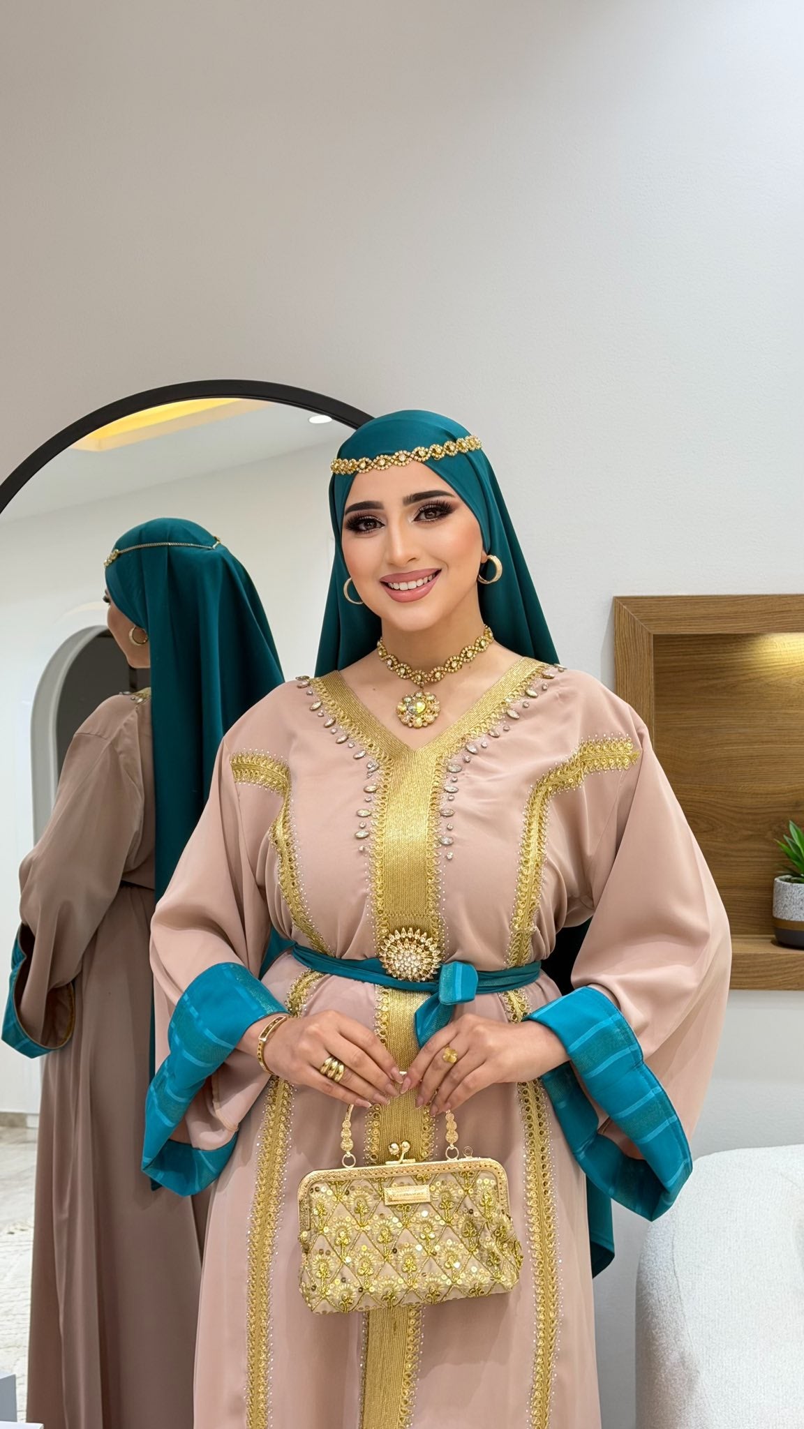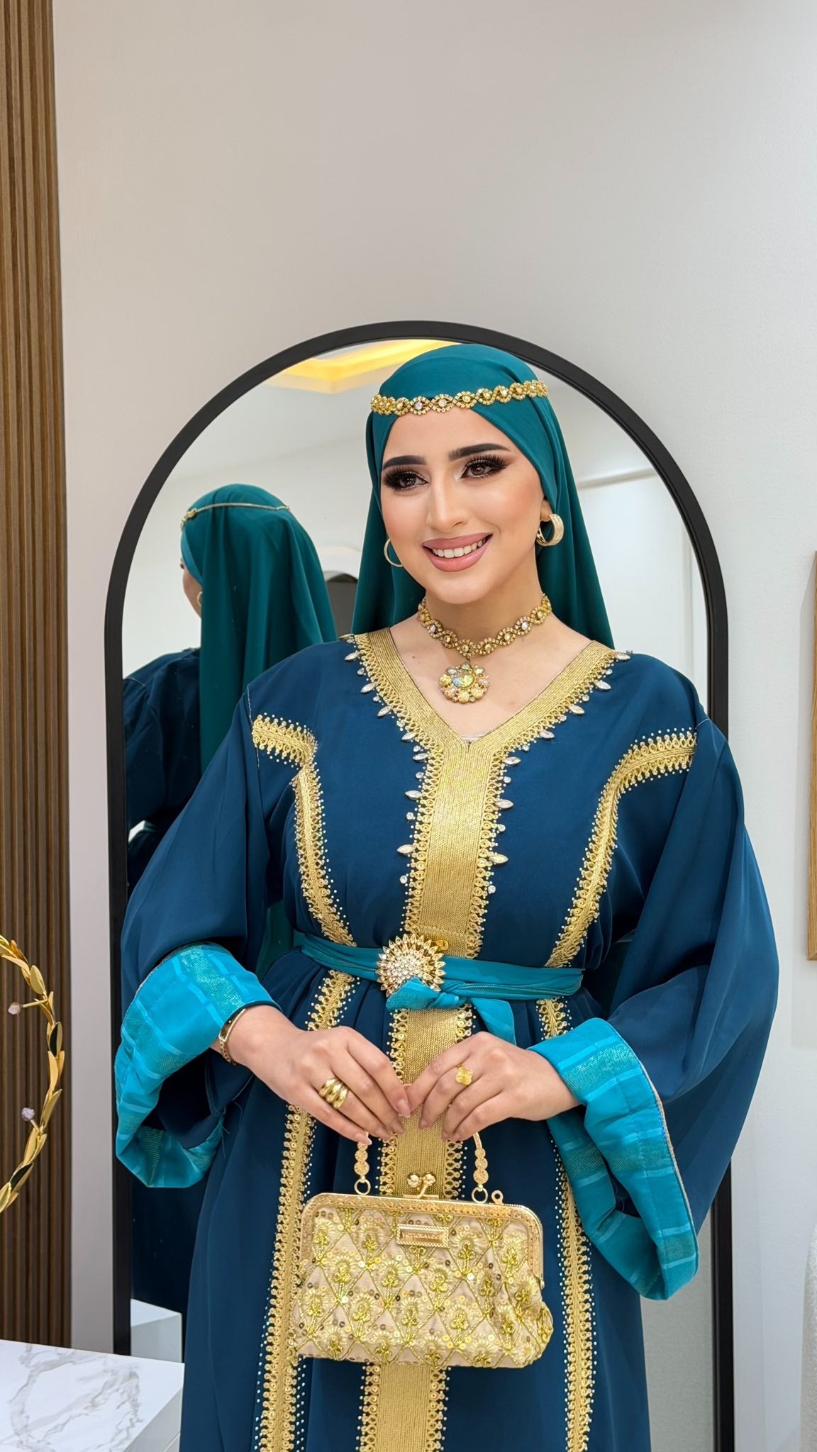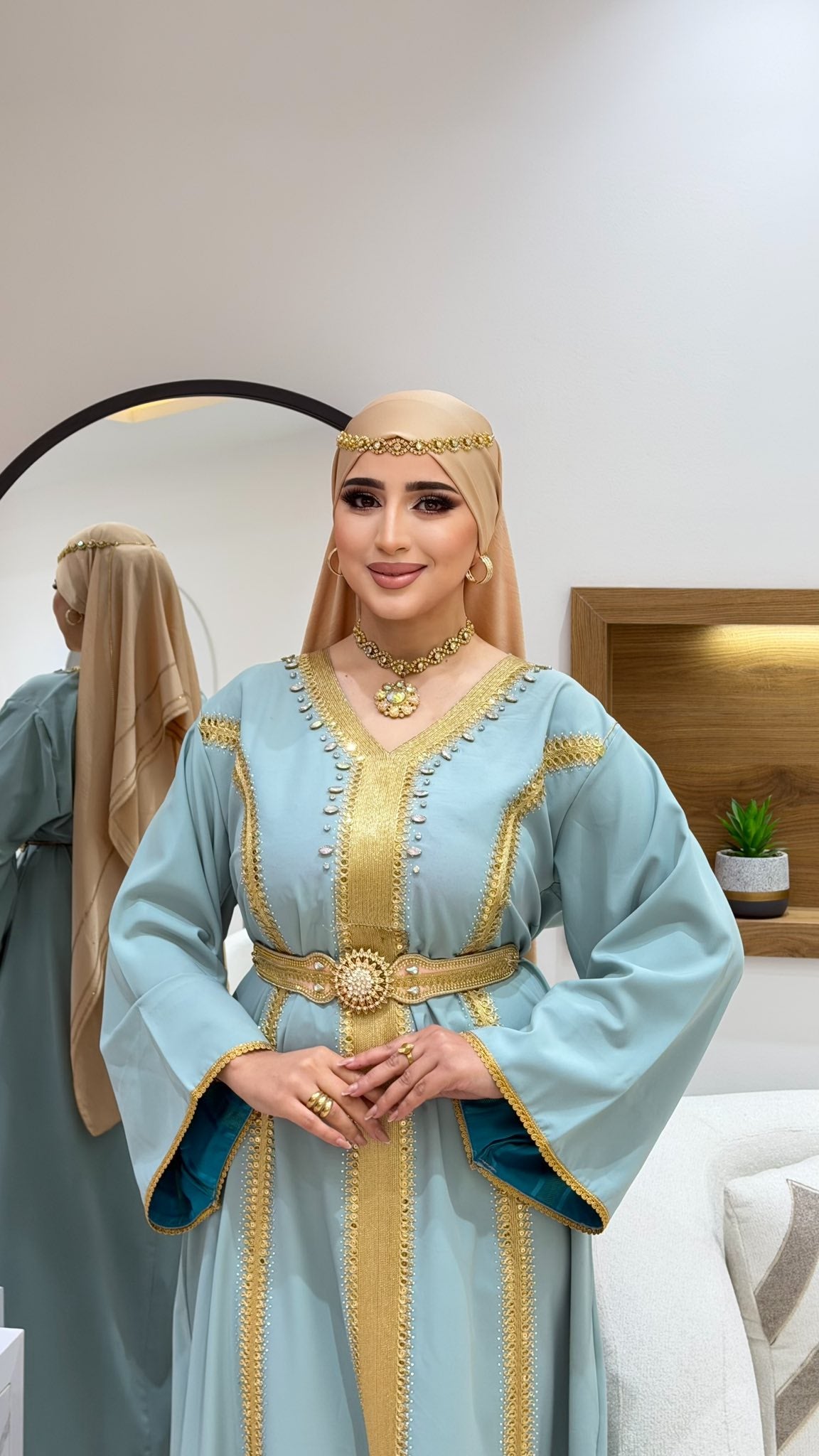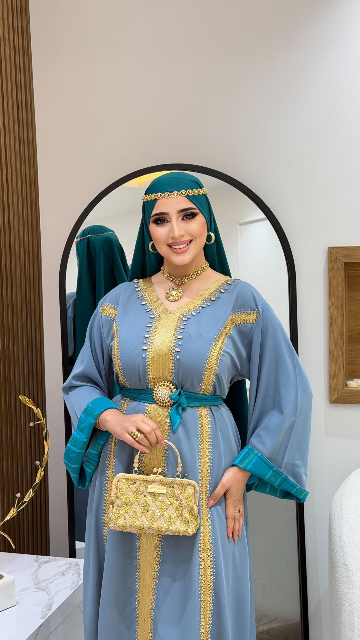 avec deux ceinture dorée et turquoise